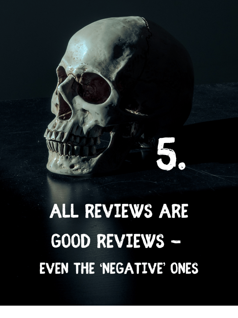 5. All reviews are good reviews, even the negative ones. All books have negative reviews and as your readership grows, you’ll likely gain more negative reviews – that’s just part of a wider range of people reading your book. You can’t please everyone, and negative reviews help your book to get in front of the RIGHT readers.