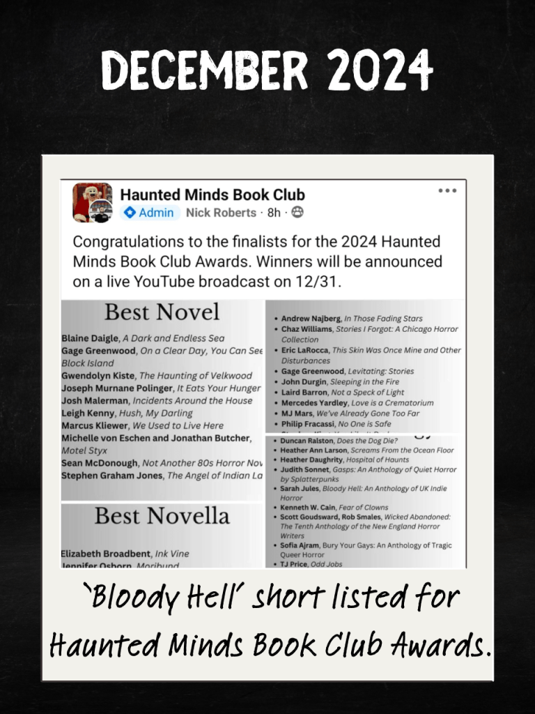 November was a nail-biter. ‘BLOODY HELL’ went up against hundreds of other books for a spot in the final 32 of the Books of Horror Short Smack. Voting takes place early next year in the Books of Horror Facebook group. We’re up against the talented RJ Roles.