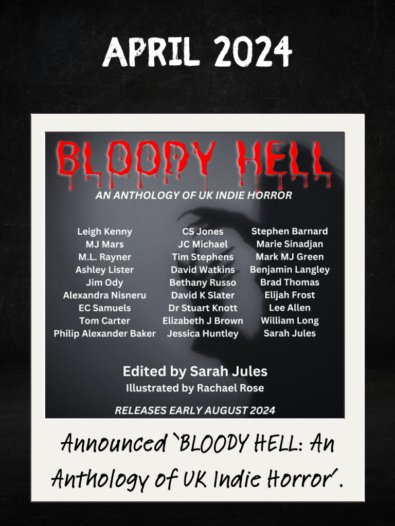 April also saw the official announcement of ‘BLOODY HELL: An Anthology of UK Indie Horror’, which I had the absolute pleasure of editing and collating. I had no intention of being the person to launch this book when I suggested the idea of an anthology championing British indie horror, but I was blown away by the support and trust of the authors. We managed to secure the incredible Rachael Rose for both the illustrations throughout the book (each story has a gorgeous illustration) and also for the cover design. I cannot tell you how proud I am of ‘BLOODY HELL’, and of all the wonderful talented humans involved in the project. It was a highlight of my year.