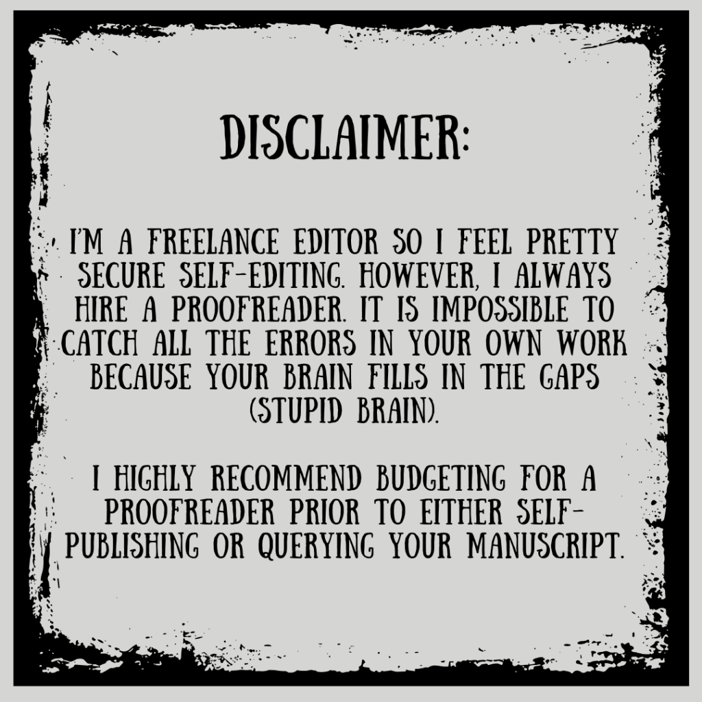 Again, a disclaimer: I’m a freelance editor so I feel pretty secure self-editing. However, I always hire a proofreader. It is impossible to catch all the errors in your own work because your brain fills in the gaps (stupid brain). I highly recommend budgeting for a proofreader prior to either self-publishing or querying your manuscript.
