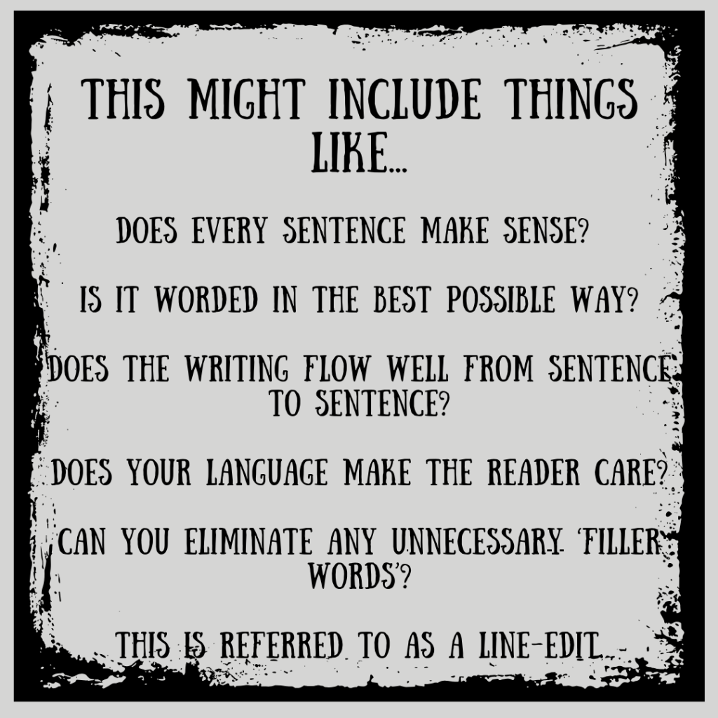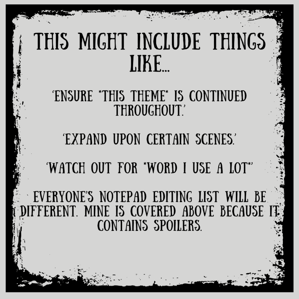 ‘Watch out for *word I use a lot*’ Everyone’s notepad editing list will be different. Mine is covered above because it contains spoilers.