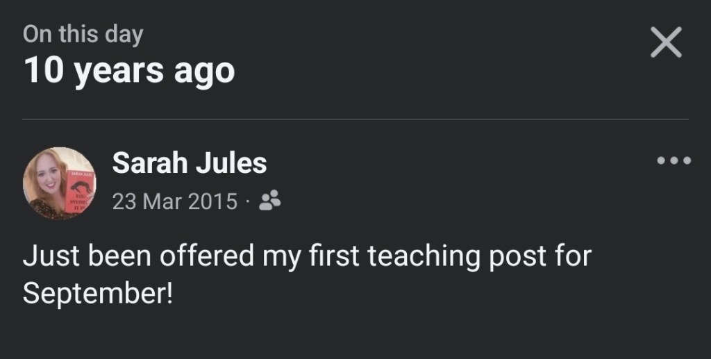 Ten years ago, I was offered my first teaching post. I was one of the first in my graduating class to be offered a job. I was over the moon. On top of that, I was set to graduate with a Chancellor’s Award for Outstanding Achievement and start my Masters degree in September. Three years of intense study and long hours felt like it was finally paying off.